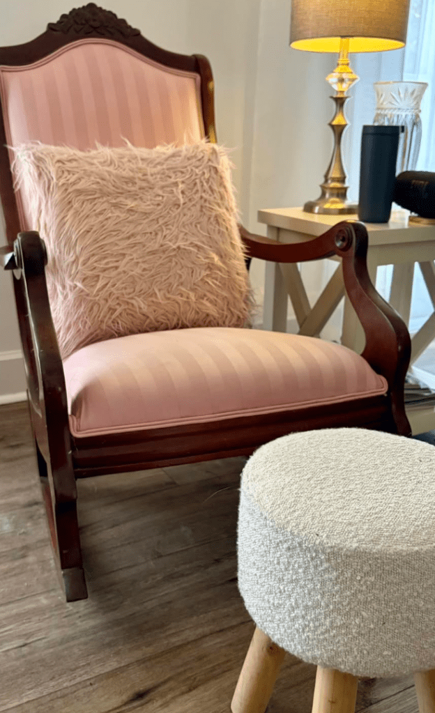I have been in physical therapy now for months, and after last week’s session I decided I might be done with the couch. I’ve known for a long time that it was not good for my back, so I decided to just take the week and sit, when I sit, in this straight back cushioned rocking chair with the pillow, as pictured above.