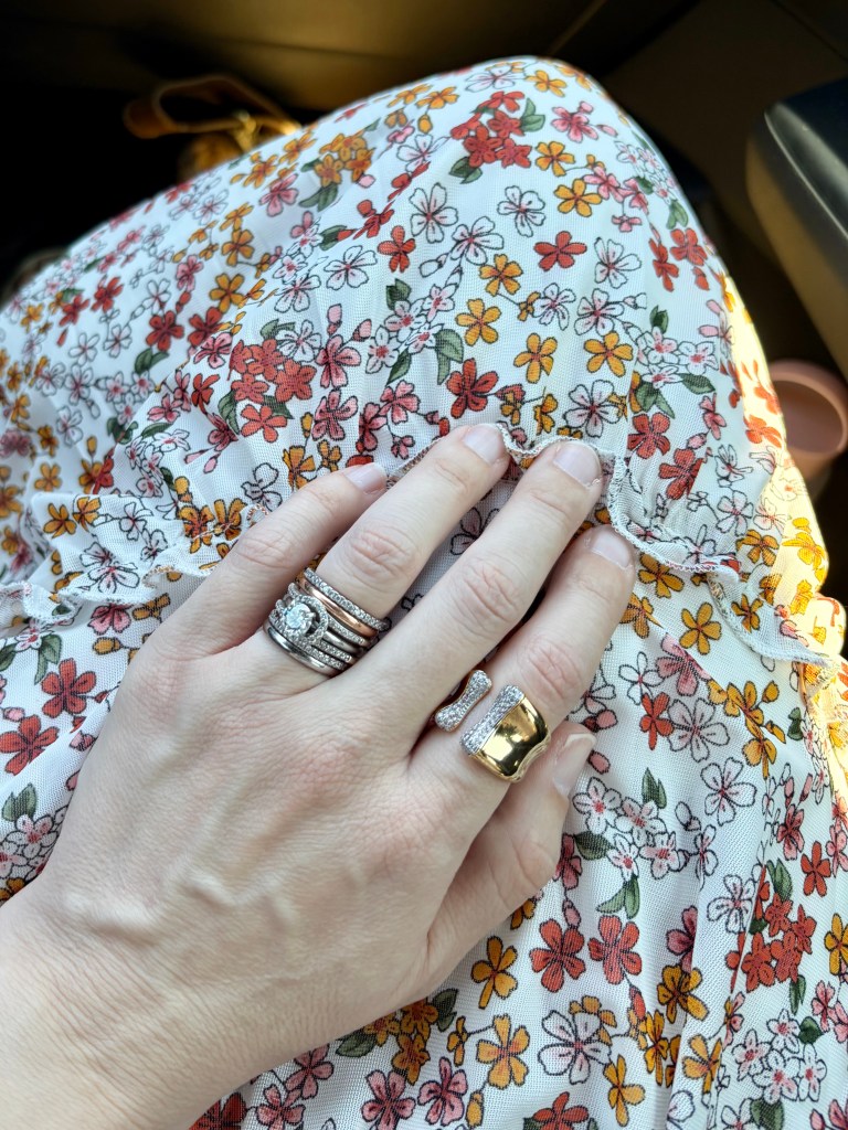 A note about my hand photo: yes, my jewelry is maximalist. No, in the grand scheme of things, it is not expensive. Jared kindly upgraded my original center diamond to a lab diamond that was less than $200 for our 20th, that we had set in a 4-prong setting I found on Etsy, and the eternity rings are moissanite and sterling, and the index finger ring was a $32 Kudzu find that I treasure because I was out shopping with a friend the afternoon I found it. I like shiny, not expensive. Jewelry on a budget is a whole other post I could do, but not today.