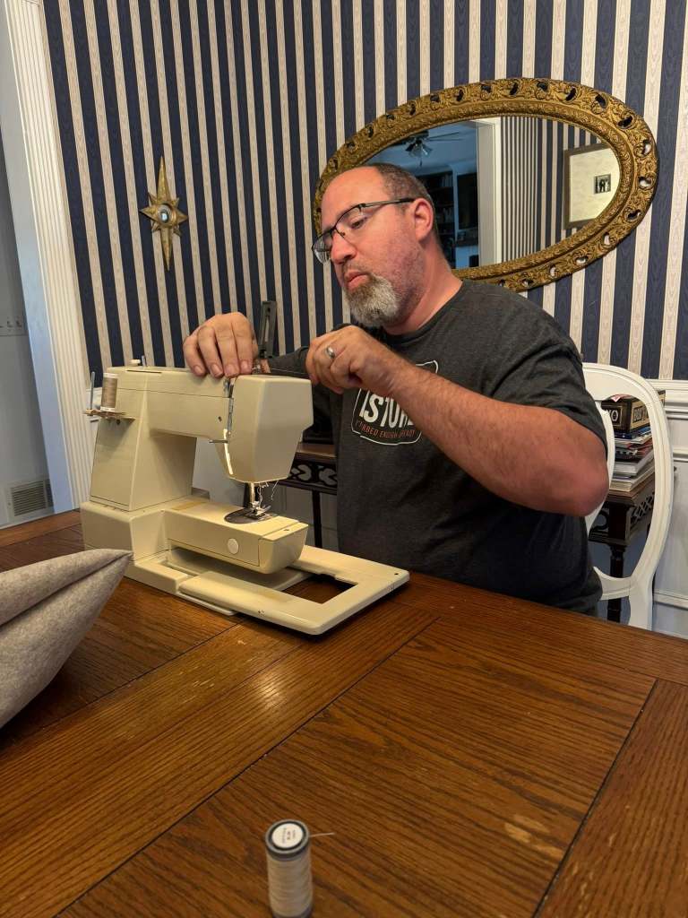All went well, until Jared was sewing away and here comes asshole Nancy, above, literally to bat the THREAD OFF THE SEWING MACHINE WHILE IT WAS SPINNING….